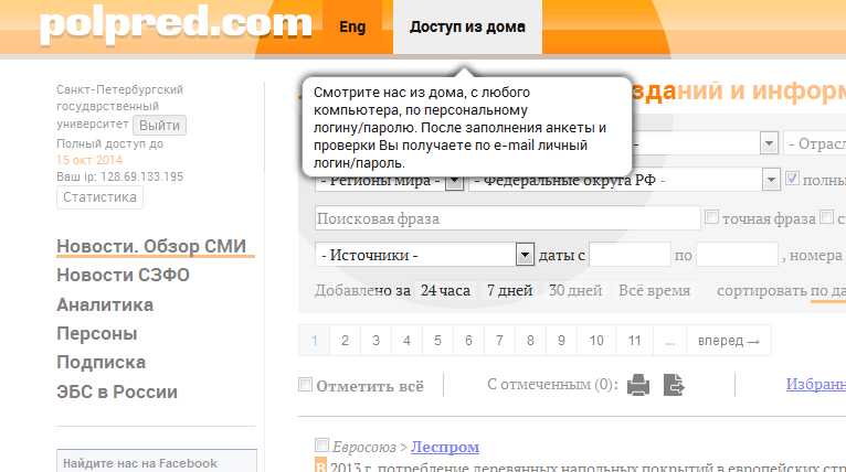 Доступ из дома? Читатель сам получает его, чтобы иметь «личные списки», «личный кабинет», т.е. закладки остаются при смене пользовательского устройства. Кнопка Доступ из дома в «шапке» polpred появляется, если библиотека авторизовалась на polpred. Отправив нам краткую анкету читатель получает письмо с личным логином доступа.