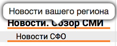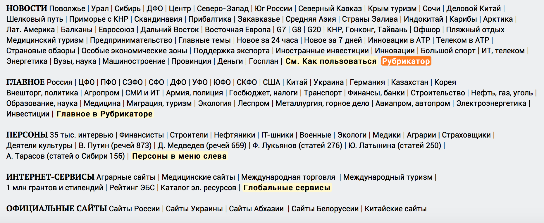 Повторяется на каждой странице портала. Меню видоизменяется, подсказывая точки интереса, по мере работы читателя с рубрикатором поиска. Меню реагирует, из какой страны или федерального округа РФ приходит читатель, предлагается соответствующий блок новостей.
