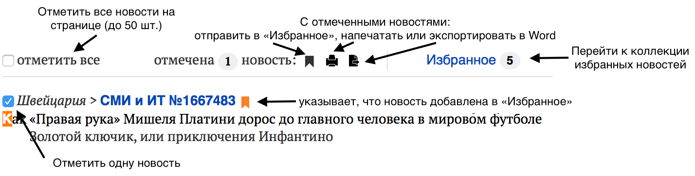 Работа с массивом информации может вестись при помощи рубрикатора и его дополнений: личные списки; избранные новости.