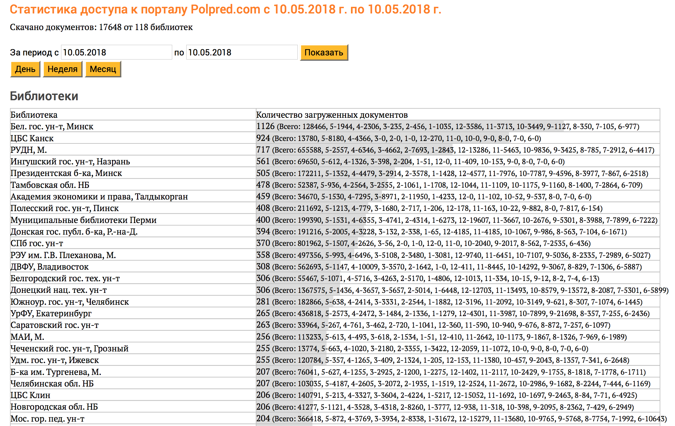 На кнопке с таким названием в меню polpred.com дана статистика пользователей данного ресурса. Polpred обслуживает на постсоветском пространстве все основные вузовские и публичные библиотеки.